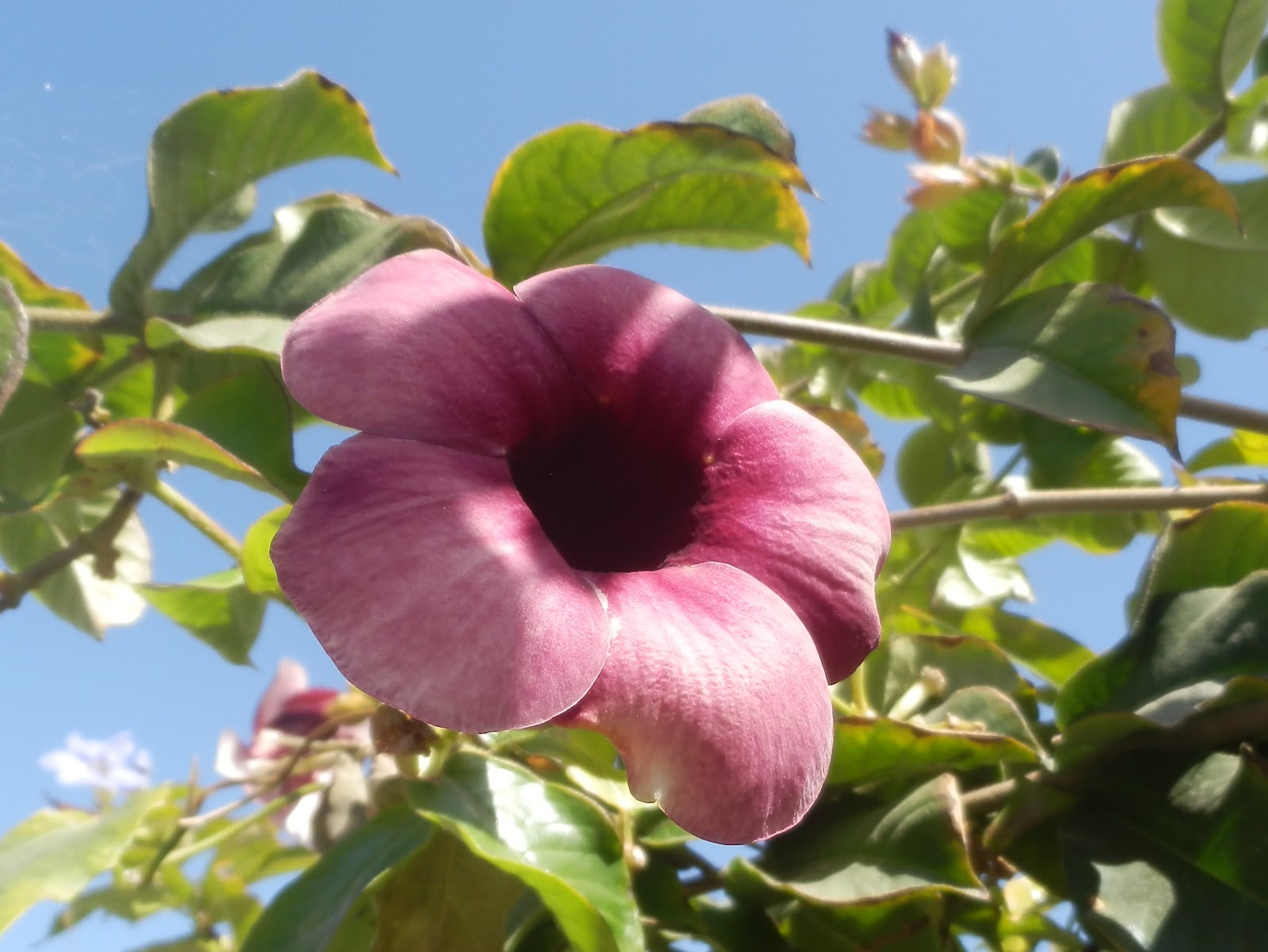 Mehrjähriger, immergrüner, buschiger Kletterstrauch bis ca. 3m mit gegenständig, in Vierergruppen angeordneten, bis zu 15cm langen und 3cm breiten, lanzettlichen, mittel- bis dunkelgrünen Blättern und attraktiven, großen, trompetenförmigen, purpurfarbenen Blüten, einzeln oder paarweise an den Zweigenden.