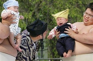 Tokio/Hamburg – Auf Europäer wirkt die Szene bizarr: Da stehen sich zwei reichlich dicke, mit einer per Bauchbinde fixierten Windel bekleidete Männer gegenüber und jeder hat ein Baby im Arm. Die Sumo-Ringer lächeln freundlich, die Babys nicht minder, das Publikum sowieso: heiter bis volksfesthaft ist die Stimmung.