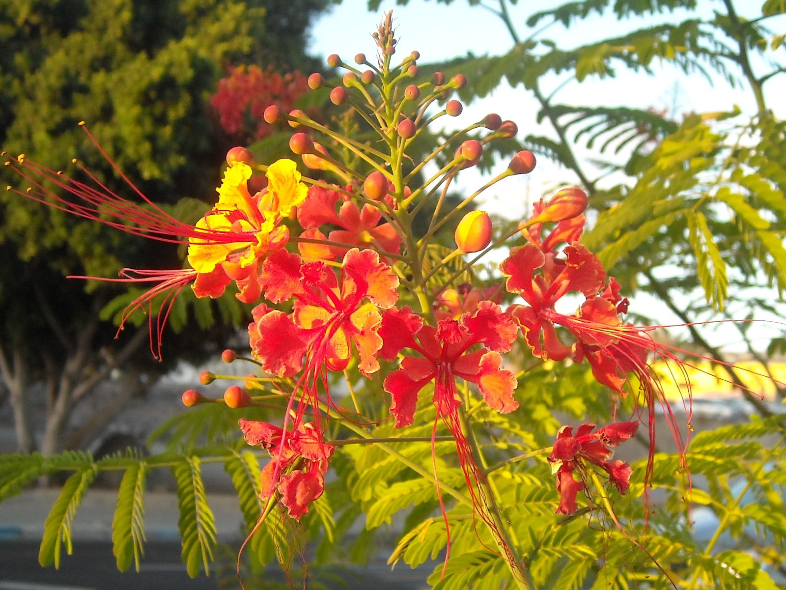 Delonix regia, auch als Flamboyant, Framboyán oder Feuer Baum, Malinche, Chivato, Rote Akazie, Tabachin und Königs Ponciana bekannt ist, stammt ursprünglich aus dem West-madagassischem Wald in Madagaskar. In Indien wird er Gulmohar genannt, in Englisch, Flamboyant tree (Flammenbaum), Peacock flower (Pfau Blume), Flamme des Waldes und Flame Tree (Flammen Baum).