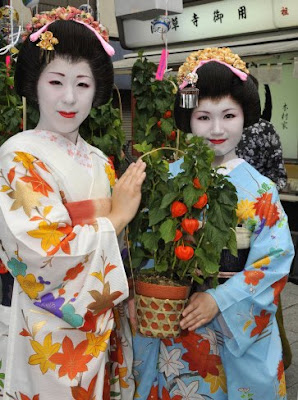 Eine geschäftsmäßig im Kimono hergerichtete Maiko auf dem Weg zu einem Bankett, weiß und rot geschminkt und mit Flitter im lackschwarzen Haar, ist eine Erscheinung, nach der sich in Kyoto auch Japaner umdrehen. Wegen der hohen, vorn wie Kähne abgeschrägten Plateausandalen, des engen Schlepprocks und des festen Obis in der Mitte, der alles platt drückt, was an einer Frau rund ist, gleichen Maikos auch rollenden Puppen, deren Untergestell sie nicht weiter als bis zum wartenden Taxi an der Ecke trägt.