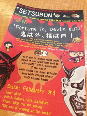 Am 3. Februar ist Setsubun(wörtlich der Tag zwischen zwei Jahreszeiten), der Hauptbestandteil dieses Festes ist ein Ritual mit dem Namen Mamemaki (豆撒き – Bohnenverstreuen), bei dem das Familienoberhaupt geröstete Bohnen aus der Haustür wirft. Manchmal wirft man sie auch auf einen als oni (鬼 – Dämon, Teufel) verkleideten Nachbarn oder Großvater (oder ein anderes Familienmitglied), was in einem Riesenspaß für die jüngsten Familienmitglieder endet.