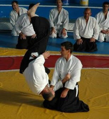 Jetzt bewegen sich Tori und Uke als wenn sie betrunken waeren, total entspannt alle beide und einer ueber den anderen fallend, zusammen den Kontakt beibehalten aufstehen und wieder hinfallen. Das lehrt uns den ganzen Koerper zu benutzen und die Koordination mit dem Partner.